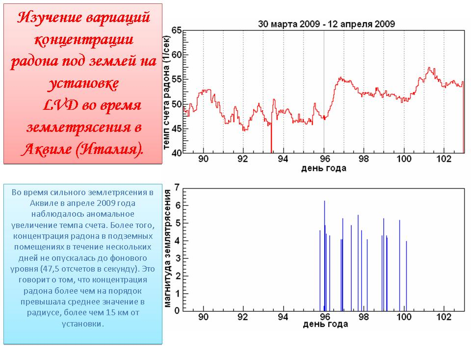 Исследования по выявлению связи поведения радоновых полей с сейсмической активностью проводятся во всем мире в течение нескольких десятилетий. На установке LVD, созданной международным содружеством организаций с участием ИЯИ РАН в подземной лаборатории Гран-Сассо, Италия, осуществляется непрерывный мониторинг концентрации радона.