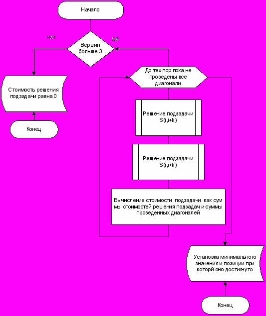 Начиная с задачи S0N рекурсивно заполняется таблица стоимостей триангуляции с сохранением индексов вершин в которые проведены диагонали.