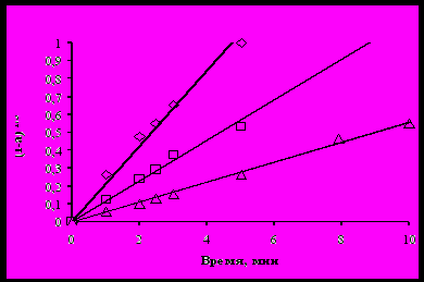Энергию активации ( Е) определяли по тангенсу угла наклона прямой в координатах ln k – (1/T), а по точке пересечения прямой с ординатой определяли предэкспоненциальный множитель kо.