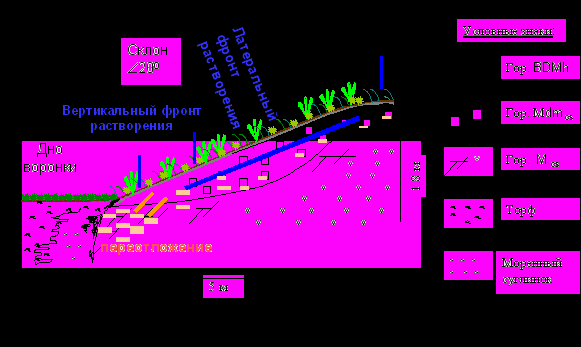 На склонах, растворение гипса под действием латеральных потоков приводит к выклиниванию дезинтеграционно-метаморфического горизонта и усиленному переотложению гипса в виде кутан в нижней части склона; при этом подстилочно-торфяный горизонт не меняется, развиваясь под однородным растительным покровом (рис. 5).