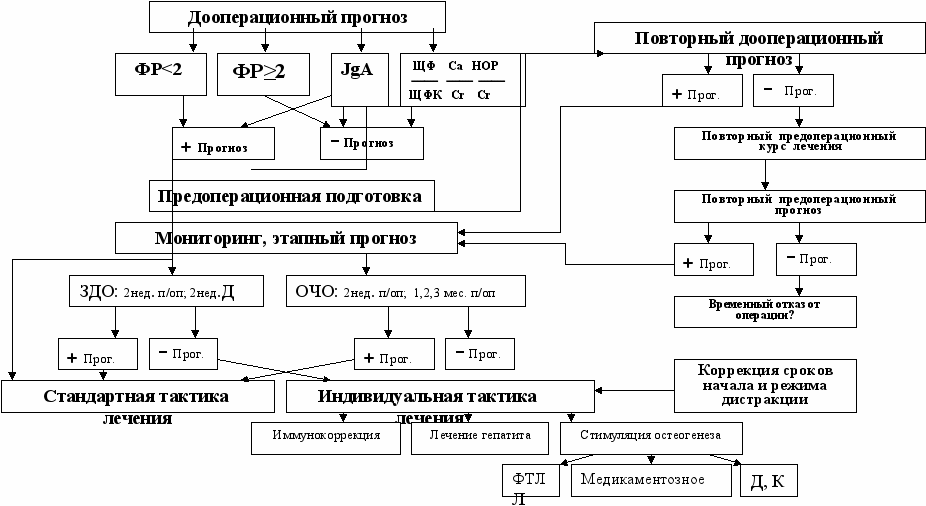 Было установлено, что на предоперационном этапе при выборе технологии лечения у больных с последствиями переломов трубчатых костей у каждого конкретного пациента кроме клинико-рентгенологического типа патологии, степени укорочения и выраженности деформации целесообразно использовать прогнозирование исхода лечения. Наиболее простым является построение прогноза по факторам риска. Введение понятия «факторы риска» и использование их в практике прогноза позволяет направленно отбирать больных, потенциально «опасных» в плане возможного неблагоприятного развития репаративного процесса при лечении этой категории больных. На основании математической обработки анамнестических, клинических и лабораторных данных с использованием обобщенного показателя χ² (критерий Пирсона) были определены как общие (хронический гепатит и нарушения иммунного статуса), так и местные факторы риска (остеосклероз и хронический остеомиелит концов отломков в фазе ремиссии, обширные кожные рубцы, сосудистые нарушения и гипотрофия мягких тканей ≥4 см). Каждому из выявленных факторов риска в зависимости от степени его значимости присваивают балл 1 или 2. Для построения прогноза возможного исхода хирургического лечения по преморбидному фону, т.е. еще до начала хирургического лечения, было разработано следующее решающее правило. Если у пациента факторы риска не выявлены или же обнаружен только один такой фактор как хронический остеомиелит или остеосклероз концов отломков, а сумма баллов не превышает 1, то ожидаемое течение костеобразования и возможный исход лечения оценивают как благоприятные. О возможном неблагополучии исхода лечения больного свидетельствует наличие одного из таких факторов, как сосудистые расстройства, обширные рубцы, выраженная гипотрофия мягких тканей, хронический гепатит любой этиологии, нарушения иммунного статуса или одновременно двух таких факторов, как хронический остеомиелит и остеосклероз концов отломков. При неблагоприятном прогнозе сумма баллов у больного с последствиями переломов костей составляет 2 или более баллов.