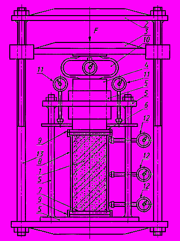 11 - измеритель продольных деформаций; 12 - измеритель поперечных деформаций; 13 - продольная тяга