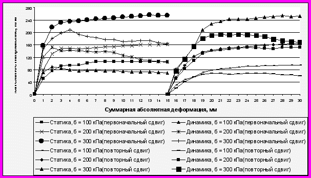 Испытания грунта статической нагрузкой проведены при нормальном напряжении 100, 200 и 300кПа. Величина деформации образца составила в опытах не менее 15мм с последующем повтором сдвига.