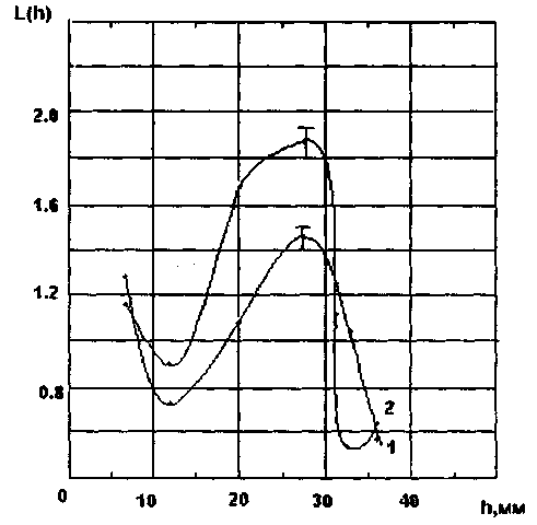 На рисунке представлена зависимость биологической активности детектора от высоты размещения препятствия. Данная структура представляет собой своеобразный интерферометр, с помощью которого определяется длина волны, излучаемой поверхностью. Под биологической активностью принята длина корешков и проростков прорастающих зерен.