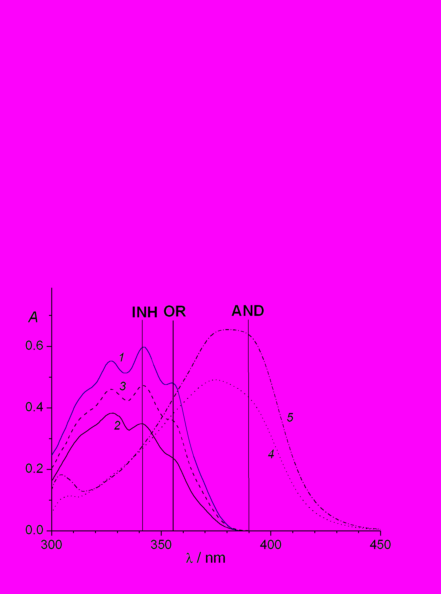 4. Показано, что при использовании в качестве входных сигналов облучения светом и протонирования, а в качестве выходного сигнала - оптической плотности, можно построить на основе производных 2-стирилхинолина разнообразные молекулярные логические устройства, тип действия которых - "ЗАПРЕТ" ("INH"), "ИЛИ" ("OR"), "И" ("AND") зависит от длины волны считывающего света. Эти логические устройства способны функционировать как в растворе, так и в полимерной матрице.