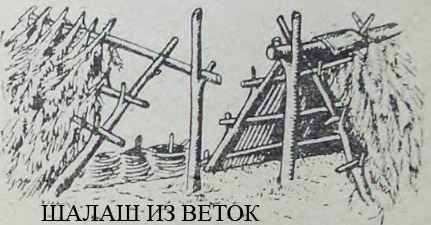 алашВ лесу можно построить шалаш из веток. Для этого вокруг расчищенной для ночлега площадки насыпь подковой земляной вал. По концам вала поставь два длинных шеста связанных накрест. По всему валу воткни наклонно жерди так, чтобы они опирались на вершину связанных шестов. Сверху покрой этот каркас хвойными ветками. Получается шалаш. Перед ним разводится костёр. Так же, как и у заслона, в шалаше спи ногами к огню. Перед постройкой шалаша определи направление ветра: вход в шалаш не должен быть с наветренной стороны. Можно устроить себе постель из еловых веток. Для этого натаскай в шалаш побольше сухого валежника, наломай прутья длиной в 75-100 сантиметров и уложи их рядом. Прутья прикрой хвойными ветвями так, чтобы комли их лежали в противоположные стороны. Подушку тебе заменит вещевой мешок.
