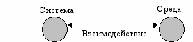 Поэтому я остановлюсь на представлении, что система находится внутри своей среды. И тогда естественно возникает следующий вопрос: а каковы взаимоотношения системы и ее среды? И вам неизменно отвечают, что система взаимодействует со своей средой. Но что такое взаимодействие? По смыслу, взаимодействие есть такое взаимовлияние двух или более объектов, которое приводит к изменению этих объектов. Типичная онтологическая схема взаимодействия имеет два обозначающие объекты кружочка или точки и соединяющую их двунаправленную стрелку – связь взаимодействия (Схема 2).