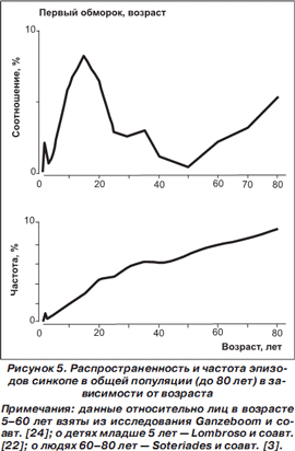 Синкопе достаточно часто встречается в общей популяции; появление первого эпизода характеризуется определенными возрастными параметрами (рис. 5). Вазовагальные обмороки встречаются у 1 % детей младшего возраста [22, 23].