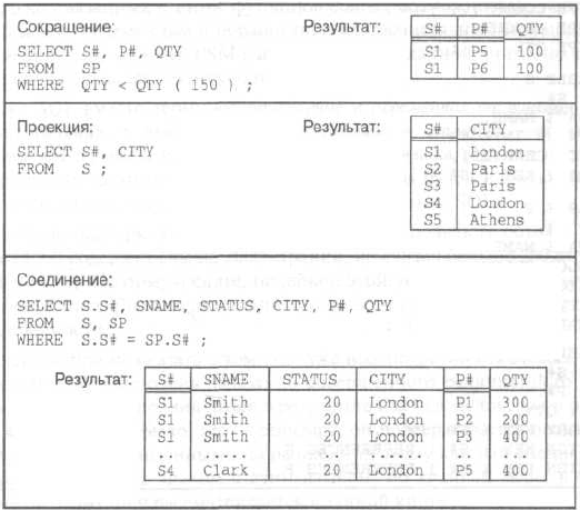 | Примеры выполнения операций выборки, проекции и соединения на языке SQL |