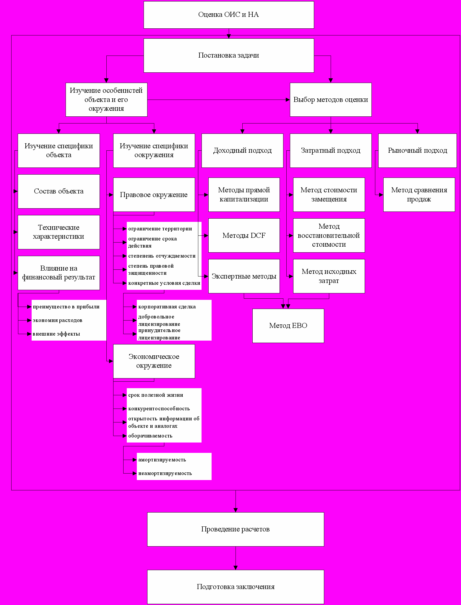При выборе метода оценки предприятия необходимо учитывать и особенности стоимостной оценки прав на отдельные ОИС (объекты интеллектуальной собственности): изобретения, дизайнерские разработки, товарные знаки, программные продукты, базы данных, интегральные микросхемы, деловые и производственные секреты, профессиональные знания и опыт сотрудников и т.д. Все они являются результатами интеллектуальной деятельности, по-своему уникальны, что исключает использование единой для всех ОИС методики расчета. В каждом случае требуется индивидуальный, конкретный подход, основанный на учете всех правовых, экономических, технических, эргономических и художественных аспектов.