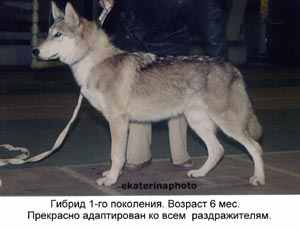 Гибрид 1-го поколения (отец щенков – гибридов 2-го поколения) ОЛЬХОН - рослый кобель (около 65 см в холке), зонарно-серого окраса, хорошо одет, глаз светло-карий, хвост держит серпом, иногда касаясь спины, иногда опускает вниз, но держит не «поленом», а «саблей». Очень породная красивая голова, с правильными, чистыми линиями, менее скуластая, чем у волка, но скуластее, чем у ЗСЛ лайки, ближе к хантыйскому типу. В профиль это вылитая голова знаменитого Свердловского чемпиона «Согома» Башмакова, с такими же линиями и таким же рисунком на морде. Ольхон осенью прошлого года участвовал в охотах на кабана. Хорошо находит и неплохо работает в стае с другими моими собаками. Голос отдает, но редко, зато делает хватки и старается работать «на поражение». К своим собакам терпим, но чужих собак не терпит. К хозяину ласков, к чужим относится настороженно. Хорошо плавает и любит воду. Зимой в него на охоте случайно стреляли, но благодаря прекрасной реакции гибрида, промахнулись: в последний момент от взмаха поднимавшегося ружья кобель отскочил в сторону, что спасло ему жизнь. Однако с тех пор стал очень осторожен к людям с ружьями и фотографировать его стало большой проблемой, потому, что он, как только увидит загоревшуюся красную точку видоискателя фотоаппарата, сразу скрывается или прячется за деревья.