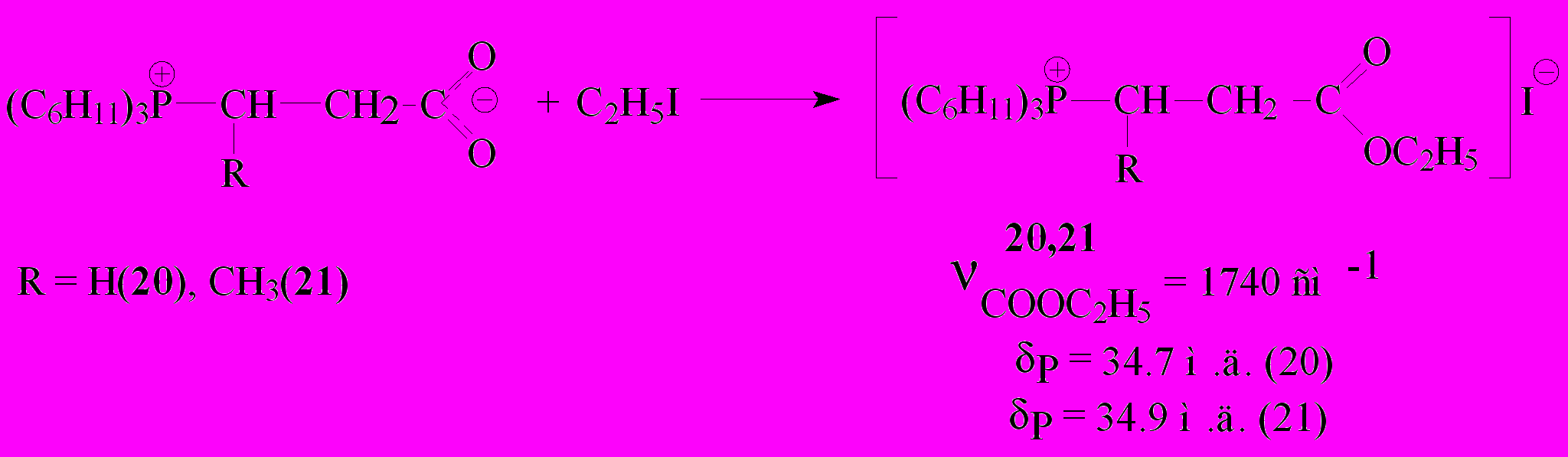 В продолжение проводимых исследований мы провели реакции алкилирования и силилирования ряда вновь полученных карбоксилатных бетаинов на основе трициклогексилфосфина и непредельных карбоновых кислот. Кроме того, мы изучили реакцию силилирования нестабильного дикарбоксилатного фосфабетаина на основе трифенилфосфина и малеиновой кислоты. Синтез данного фосфабетаина был описан ранее.
