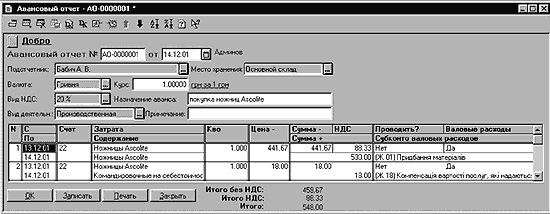 Теперь рассмотрим авансовый отчет сотрудника, который можно сформировать через меню Документы/Прочие, пункт Авансовый отчет. На рис. 2 представлена заполненная форма документа. Поскольку командировка была целевой, суммы суточных включаются в первоначальную стоимость МБП.