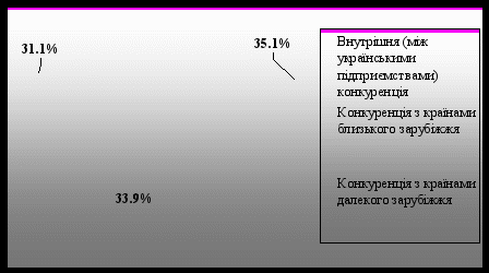 Аналіз даних рис. 1.2 свідчить про приблизно рівномірний розподіл конкурентного середовища України в 2007 році. Найбільшою складовою залишається внутрішня конкуренція українських підприємств між собою (35.1 % конкурентного середовища України в цілому); далі знаходяться сегменти конкуренції з країнами далекого (33.9 %) та близького зарубіжжя,(31.1 %).