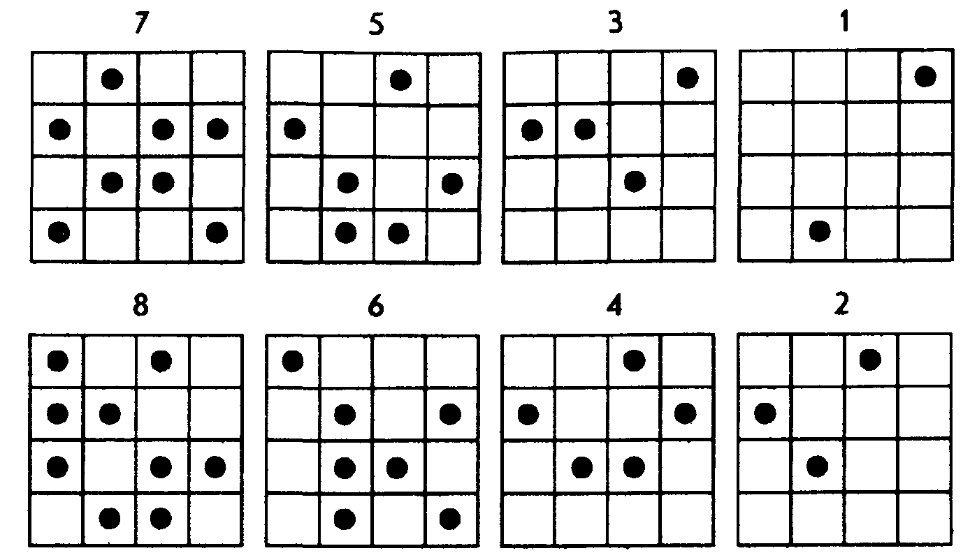 Далее ребенку последовательно, на 1-2 сек, показывается каждая из восьми карточек с точками сверху вниз в стопке по очереди и после каждой очередной карточки предлагается воспроизвести увиденные точки в пустой карточке (рис. 10) за 15 сек. Это время дается ребенку для того, чтобы он смог вспомнить, где находились увиденные точки, и отметить их в пустой карточке.