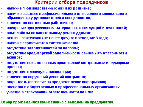 результате проведения государственной экспертизы сметная стоимость была снижена на 269,7 млн. рублей, что позволило отремонтировать большее число домов.Э6 отбор подрядчиков