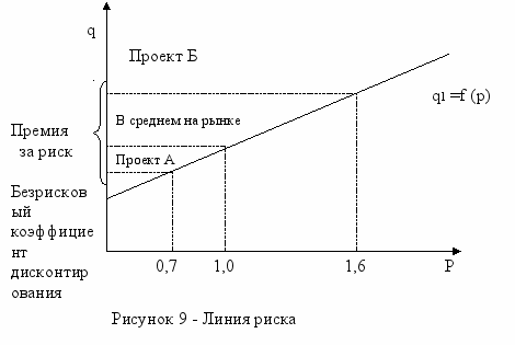 Сначала устанавливают исходную «цену» капитала, предназначенного для инвестирования (qн), затем определяют риск (например экспертным путем), связанный с данным проектом: для проекта А – PА, для Б – Р. После этого рассчитывают NPV с коэффициентом дисконтирования q: