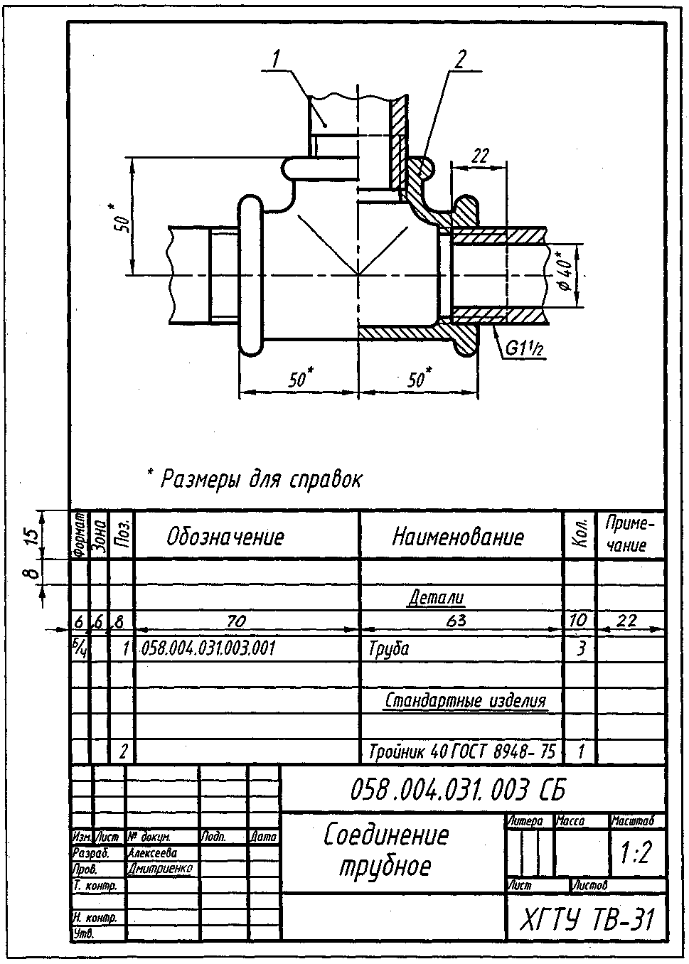Над основной надписью составить спецификацию, в которой трубы вписать в раздел «Детали», а соединительную деталь – в раздел «Стандартные изделия». Всем деталям присвоить номера позиций, которые идут в порядке возрастания и указываются в графе «Поз.». Номера позиций указывают на поле чертежа на полках линий-выносок, проводимых тонкими линиями, начинающимися с утолщённой точки, от изображений составных частей. Номера позиций располагают параллельно основной надписи чертежа и группируют их в колонку или строчку. Размер шрифта номеров позиций должен быть на один-два размера больше, чем размер шрифта, принятого для размерных чисел на том же чертеже.
