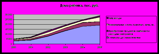 Источник: оценки Департамента социальной защиты населения Администрации Томской области По уже приводившимся оценкам, построенным на данных Доклада о положении детей в Томской области в 2005 году, средний срок пребывания несовершеннолетних в социальных приютах области в 2005 году составил 3,5 мес. Таким образом, бюджетные расходы в среднем на одного воспитанника в социальных приютах составили 144686*3,5/12=42 200 руб. 5.2 Дома ребенка Имеющиеся данные бюджетной отчетности позволяют проследить динамику расходов бюджета Томской области на содержание домов ребенка за период с 2000 по 2005 г. Сопоставление бюджетных расходов с численностью детей, содержавшихся за этот период в детских домах (данные имеются за 2002-2005 гг.), дает оценку стоимости содержания 1 ребенка в доме ребенка в течение года. В 2005 году стоимость этой услуги составляла 207 тыс. руб. Таб. 5.2.1. Расходы бюджета Томской области на содержание домов ребенка в 2000-2005 гг., тыс. руб.
