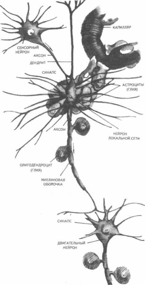 Рис. 5. Участок нервной структуры головного мозга. На рисунке показан крупный нейрон с множеством дендритов. Он получает информацию через синап-тический контакт с другим нейроном (в левом верхнем углу). С помощью другого, миелинизированного аксона образуется синаптический контакт с третьим нейроном (внизу). Поверхности нейронов изображены без клеток глии, которые окружают отросток, направленный к капилляру (справа вверху)