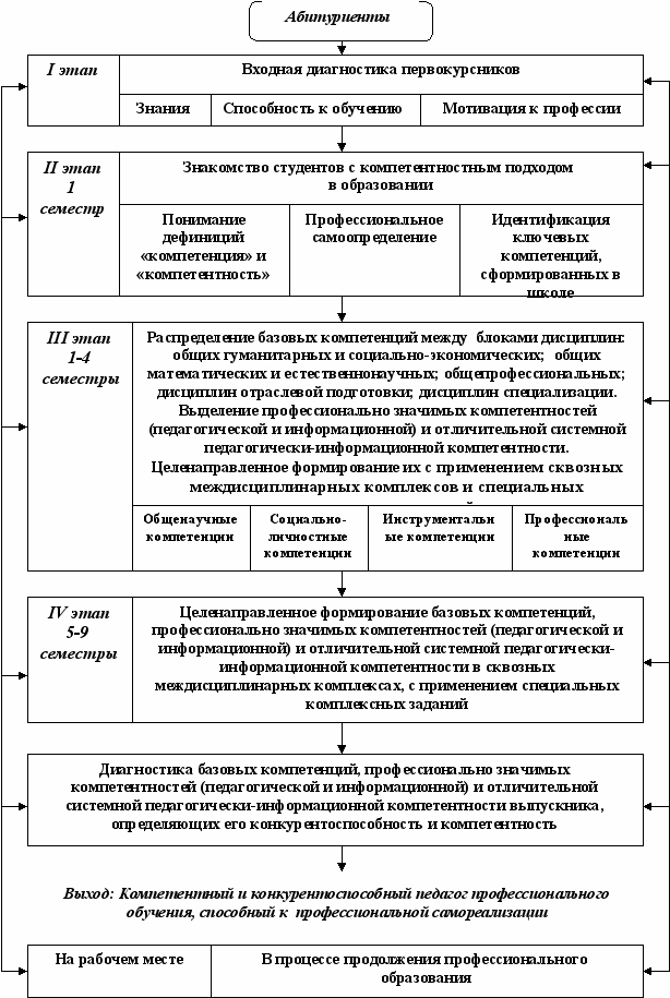 - спроектировать содержание и технологию реализации сквозных междисциплинарных комплексов, направленных на целостное формирование базовых компетенций и профессионально значимых (педагогической и информационной) компетентностей на основе идей компетентностно-ориентированного профессионального образования, для достижения гарантированного уровня качества компетенций и компетентностей педагогов профессионального обучения;