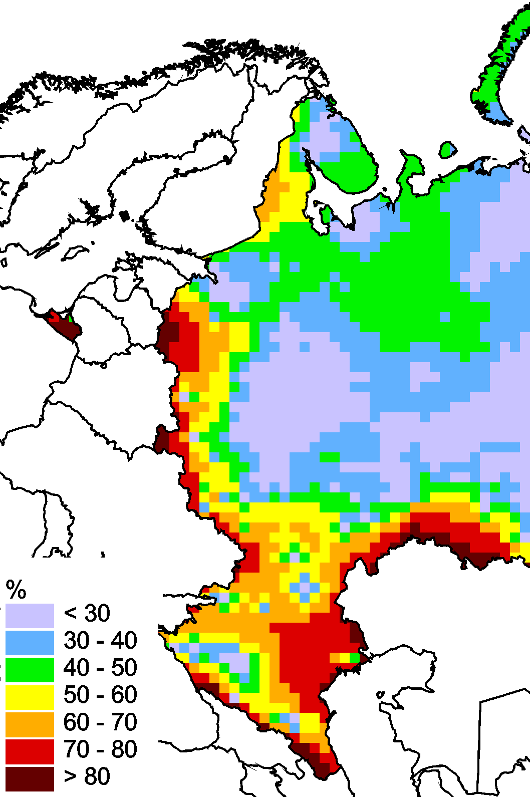 Максимальная доля трансграничных выпадений кадмия (>60%) определена на всей территории Калининградской области, в Псковской области (площадью более 32 тыс. км2), в ряде районов Смоленской и Брянской областей, Краснодарского края, Карачаево-Черкесской Республики, республик Северная Осетия – Алания и Дагестан (1.16б). На площади около 85 тыс. км2 доля трансграничного выпадения кадмия составила 50–60% от общих выпадений кадмия.
