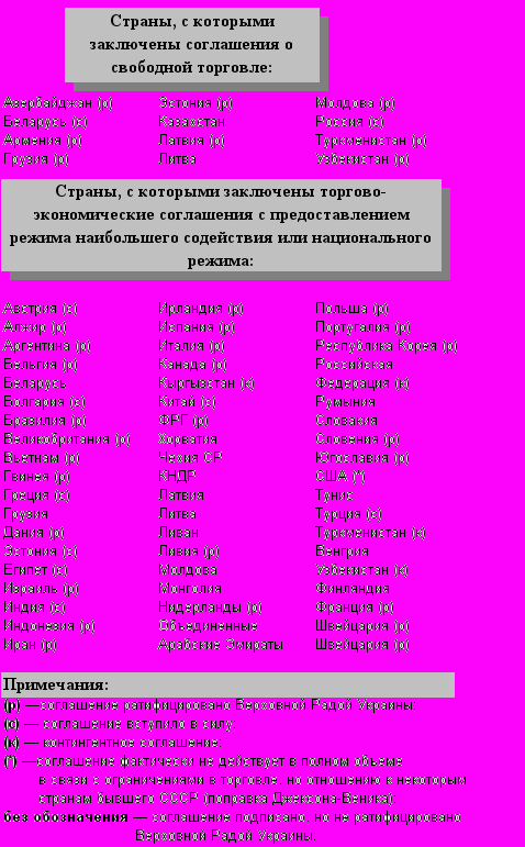 В настоящее время действует перечень стран, с которыми Украиной заключены соглашения о свободной торговле и торгово-экономические соглашения с предоставлением режима наибольшего благоприятствования или национального режима. При ввозе на таможенную территорию Украины товаров и других предметов, происхождением из указанных в перечне стран, применяются льготные ставки ввозной пошлины (табл. 1).