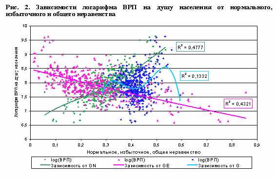 Во-первых, общее неравенство доходов населения внутри регионов относительно слабо связано с макроэкономическими показателями, тогда как нормальное и избыточное неравенство проявляют сильные и устойчивые связи с уровнями валового регионального продукта (ВРП) на душу населения, с показателями сбора налогов, с доходами и расходами региональных бюджетов, с инвестиционными вложениями и другими макроэкономическими показателями.