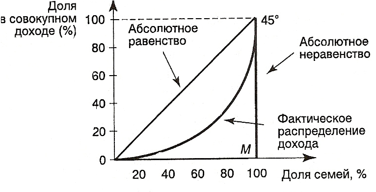 На оси абсцисс в процентном соотношении приводится доля семей, а на оси ординат – доля в совокупном доходе. Все население и все доходы разделены на 5 групп (по 20%). Если бы доходы были распределены равномерно, то это бы показала прямая линия, идущая из начала координат под углом в 45° (здесь кривая Лоренца свидетельствует об абсолютном равенстве). На самом же деле доходы распределены неравномерно, и это иллюстрируется кривой, расположенной ниже прямой в 45° (кривая Лоренца свидетельствует о фактическом распределении доходов). Чем дальше от прямой в 45° расположена кривая Лоренца, тем больше степень неравенства в обществе. При абсолютном неравенстве 1% семей имеет все 100% дохода, остальные же не будут иметь ничего (кривая Лоренца образует прямой угол с вершиной в точке М). /11/