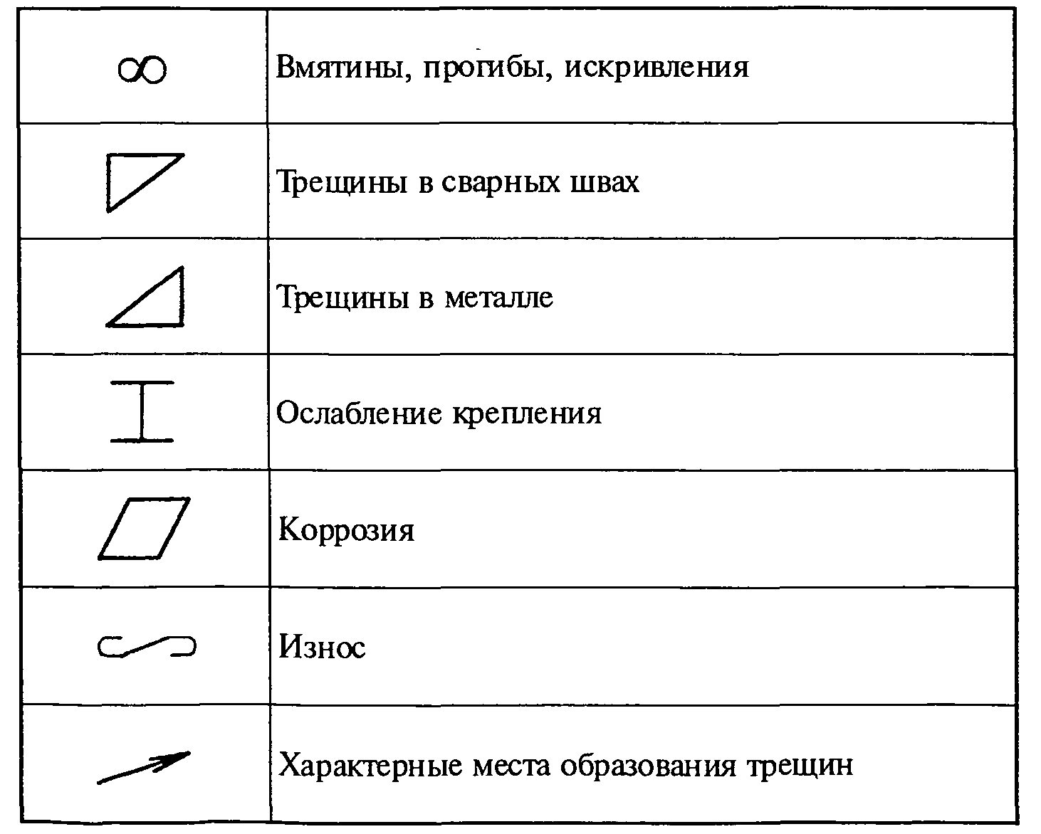 Типовые места металлоконструкций, механизмов и узлов отечественных и импортных подъемников, где возможно образование трещин, даны на рис. 5.1-5.9. Принятые условные обозначения, используемые в Карте осмотра подъемника, приведены в табл. 5.1. Осмотр подъемника выполняется в последовательности, изложенной на рис. 5.2 и в табл. 5.2 в соответствии с моделью подъемника.