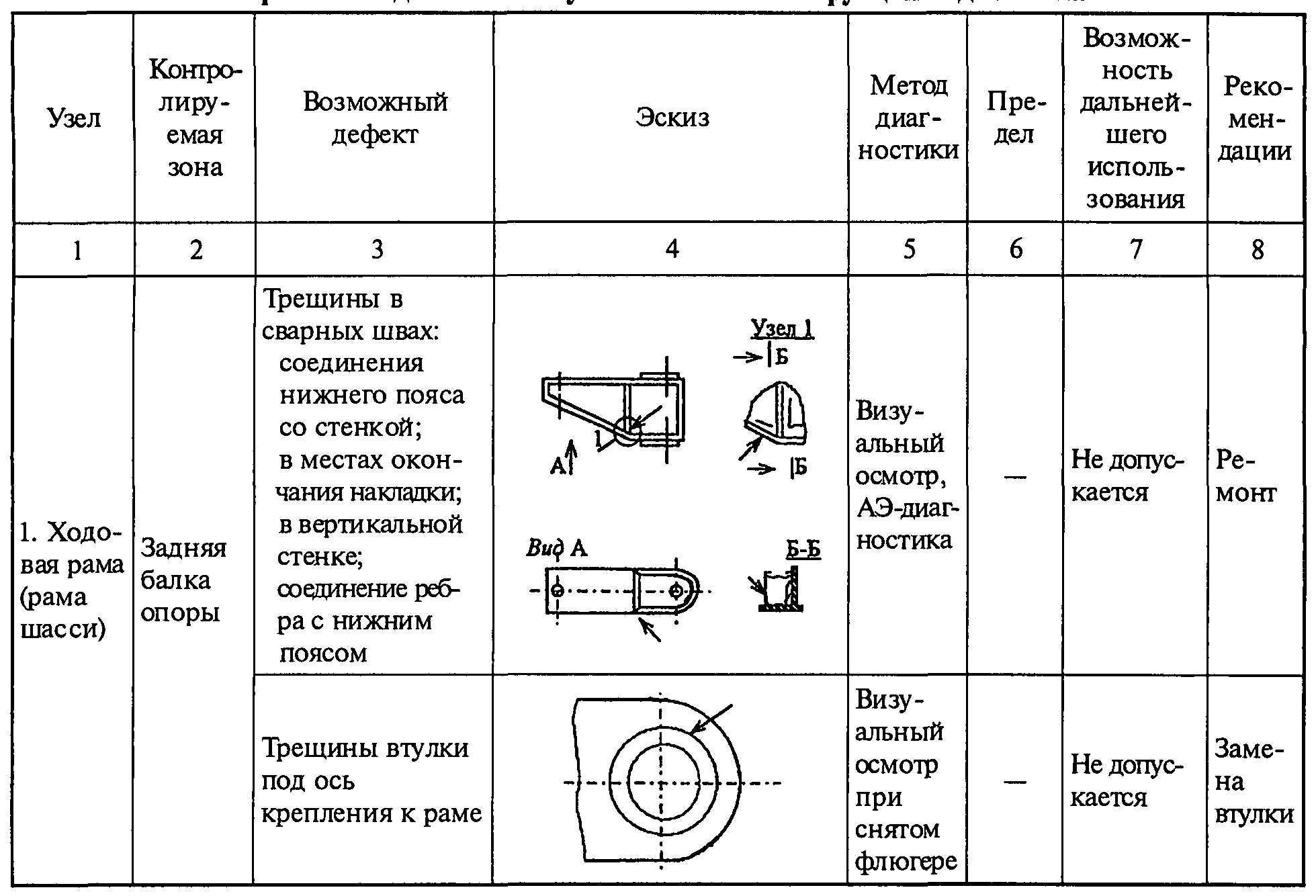 │ 1 │Шасси │Ходовая рама│Осмотр, лупа,│Разрыв балок,│