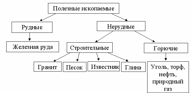 | 4. | Работа над новой темой. О поверхности много знаете вы, Ответы достойны похвалы. Открыты ворота подземной страны. Любые клады на карте найдёте вы. Работа в группах. На доске: План: 1. Название. 2. Свойство. 3. Способы добычи. 4. Значения и применение. 1 группа: Гранит 2 группа: Известняк 3 группа: Песок и глина 4 группа: Торф 5 группа: Уголь 6 группа: Нефть 7 группа: Природный газ 8 группа: Железная руда Готовятся 5-7 минут. Рассказывают. Мы сегодня узнали о полезных ископаемых, об их применении. Сейчас мы заполним таблицу-схему. На доске: ![]() Все полезные ископаемые делятся на две большие группы: рудные и нерудные. - Какие рудные полезные ископаемые вы знаете? (железная руда) А нерудные полезные ископаемые делятся ещё на две группы: строительные и горючие. |