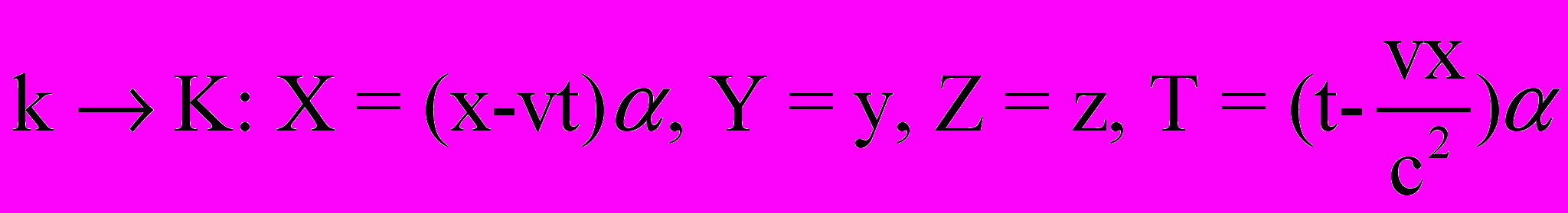 k K: X= x - vt, Y= y, Z= z