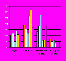 На рисунке 13 представлены данные пациентов, получивших 1 курс лечения, а затем получавших только таблетированные ноотропы; получавших лечение ежегодно; получавших лечение 2 раза в год. Рассматриваются данные наблюдения в течение 5 лет, т.е. 10 контрольных осмотров. Если учесть, что стационарное стимулирующее лечение получали больные с более тяжелыми формами ЧАЗН, можно сделать вывод, что проведение комплексной терапии 2 раза в год приводит к значительному снижению количества прогрессирующих форм атрофии, увеличению случаев стабильного течения и некоторого улучшения состояния зрительной системы.