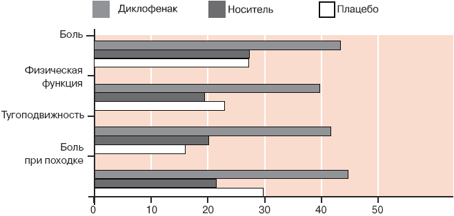 Пациенты были разделены на три группы: местного диклофенака с диметилсульфоксидом, диметилсульфоксидом только (мазь) и плацебо без диклофенака и низким содержанием диметилсульфоксида. Всего в исследовании участвовало 248 пациентов (60% — женщины, средний возраст — 62 года). Почти 90% участников закончили исследование. Основной причиной выбывания было отсутствие эффекта (8 из 80 в группе мази и 10 из 84 в группе плацебо) и местные побочные эффекты диклофенака (5 из 84) и мази (3 из 80). По результатам исследования показатели шкалы WOMAC для боли, физического функционирования, скованности, боли при ходьбе уменьшились значительно в группе диклофенака по сравнению с группами контроля. Общая оценка состояния пациентами также улучшилась значительней в группе диклофенака (Рис.1)