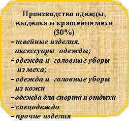 Наибольший удельный вес в ассортиментной структуре по объему вырабатываемой продукции занимает текстильная, швейная и меховая отрасли -75 процентов, объединенные вместе не только по видам экономической деятельности, но и в единой технологической цепочке. Причем доля текстильной продукции составляет 45 процентов. На швейные изделия и изделия из меха приходится 30 процентов, на продукцию кожевенно-обувного производства около 25 процентов (рис.2).