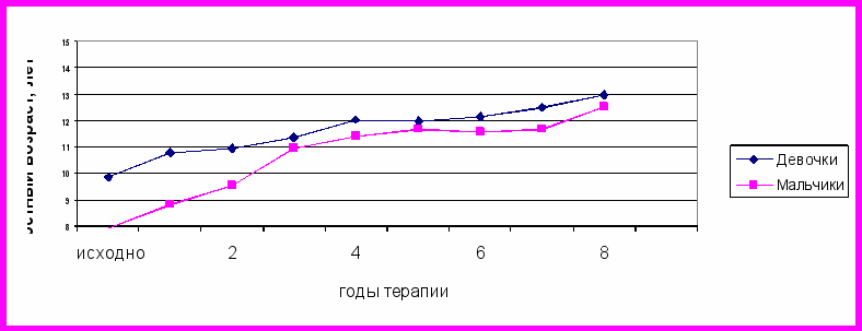 Рисунок 5. Динамика костного возраста на фоне терапии препаратами СТГ.Одним из основных критериев эффективности длительной терапии является половое созревание. У 100 детей – 65,79% наступил спонтанный пубертат в 14-15 лет (из них 51 ребенок – 51 % с наличием изолированного дефицита гормона роста; 49 детей – 49% имели сопутствующий дефицит других тропных гормонов гипофиза, за исключением ЛГ и ФСГ). У 30 детей – 19,73% имел место вторичный гипогонадизм, им проводилась индукция пубертата по достижении костного возраста 14-15 лет. У 22 детей судить о характере пубертата пока не представляется возможным, т.к они еще не достигли пубертатного возраста.