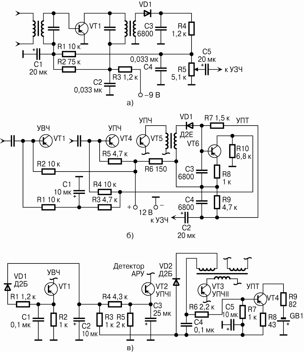 а – «простая» АРУ с задержкой; б – АРУ с задержкой и усилителем постоянного тока (УПТ); в – двухкаскадная задержанная АРУ с УПТ в профессиональном радиоприемнике