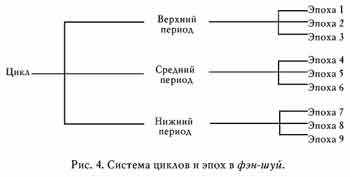 В западной астрологии годовой цикл разделен на 12 солнечных знаков зодиака. Сейчас мы вошли в эру Водолея, которая продлится 2000 лет. В фэн-шуй существует сходная циклическая концепция времени, но чуть более усложненная. Вместо разделения времени по созвездиям, в китайской системе время делится на 9 эпох, каждая из которых продолжается 20 лет. Три эпохи образуют один период, поэтому для завершения полного цикла требуется 180 лет. Каждому периоду присвоен порядковый номер, от 1 до 9, всегда в восходящем порядке (см. рис. 4). Такое разделение времени происходит от мистического математического построения, называемого диаграммой ло шу, а также от восьми гуа (триграмм) из "Книги Перемен" ("И-Цзин" по-китайски).