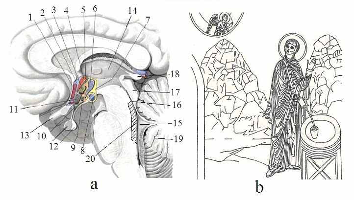 Рис 3. Структуры мозга (а) и вариант иконы Благовещенье (b)[VIII]. Ядра гипоталамуса (1 - 7); 8-углубление воронки; 9-воронка гипофиза; доли гипофиза (10-12); 13-зрительный перекрест; 14-III желудочек; 15 – IV желудочек; 16 - сильвиев водопровод; 17 – четверохолмие; 18 – эпифиз; 19 – мозжечок. На заштрихованную область ромбовидной ямки (20) проецируются пары ядер многих черепно-мозговых нервов (V-тройничный, VI-отводящий, VII-лицевой, VIII-преддверно-улитковый, IX-языкоглоточный, X-блуждающий (вагус), XI-добавочный, XII-подъязычный, ХШ–промежуточный).