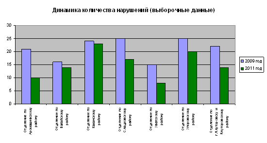 Статистика по проведенным в УФК по Тюменской области проверкам представляется следующими данными. Помимо 46 комплексных и тематических проверок, организованных и проведенных ОВКиА в 2011 году, отделами Управления с участием ОВКиА по отдельным вопросам, проведены 25 мониторингов по различным направлениям деятельности Управления и отделений. Так, проведены мониторинги и контрольные срезы по таким значимым направлениям деятельности, как соблюдение порядка проведения кассовых выплат по целевым субсидиям и субвенциям, формирование регистров бюджетного учета, своевременность доведения бюджетных данных, выписок из лицевых счетов клиентов и др.