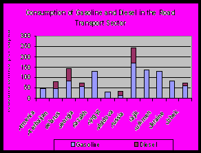 Good headline indicators would be ‘population exposed to concentrations of particular matter exceeding a certain standard’ or ‘population suffering from acute respiratory illnesses’, but they are not currently available in EECCA. The first indicator presented below refers to all respiratory diseases, and so it is only weakly linked to air pollution. The second indicator presented below (consumption of fuels in the road transport sector) is also linked to air pollution concentrations and associated health impacts in a weak way. For instance, the indicator does not refer only to emissions in highly polluted urban areas, and the same amount of fuel consumption can be associated to different levels of pollutant emissions (depending on fuel quality and car technology among other factors), concentrations (depending on location of emissions, geography and climate), exposure (depending on distribution of population and lifestyles) and thus to the ultimate health impacts. Nevertheless, improvements in car fuel efficiency and reduction of car trips due to increased public transport, all of which would result in improved health outcomes, would be captured by the indicator.