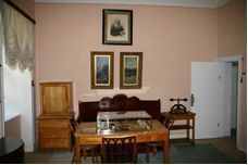 лужила Л.Н. Толстому кабинетом в 1862-1864 гг. и в 1887-1902 гг. Здесь созрел план и написано начало "Войны и мира", а также "Царство божие внутри вас", "Отец Сергий", "Хозяин и работник", "Что такое искусство?", "Живой труп", «Плоды просвещения», отдельные главы романа "Воскресение", "Крейцерова соната", "Хаджи-Мурат" и др. В 1891 г. И.Е. Репин в этой комнате писал картину "Толстой в яснополянском кабинете под сводами". На стене напротив входа - портрет Л.Н. Толстого (Ю.И. Игумнова. 1902 г., Гаспра). На стене против окна - 2 фотографии Л.Н. Толстого в кругу родных и знакомых в день его 70-летия (1898 г.). фотографии сыновей писателя (1903 г.) и С.А. Толстой с дочерьми (1903 г.), фотография Л.Н. Толстого (Ялта). На стене рядом с входом - фотография Л.Н. Толстого в день 75-летия (1903 г.) В 1910 г. здесь жила младшая дочь Л.Н. Толстого -Александра Львовна. Сюда в ночь на 28 октября 1910г. спустился писатель, сказав Александре Львовне о своём отъезде из Ясной Поляны."Комната для приезжающих"
