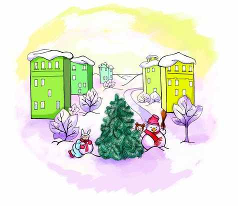 Когда-то на этом месте был лес. Но время шло, деревья вырубили и построили многоэтажные дома. А во дворе одного из домов оставили маленькую пушистую елочку. Сначала ей было очень грустно одной. Но вскоре в доме поселились жильцы, и одиночество кончилось – во дворе стали играть дети. Из-за елочки выскакивала «хитрющая лиса» и ловила «ушастых зайчиков», за ней прятался «зубастый волк», а иногда «сам медведь» устраивал под ней берлогу.