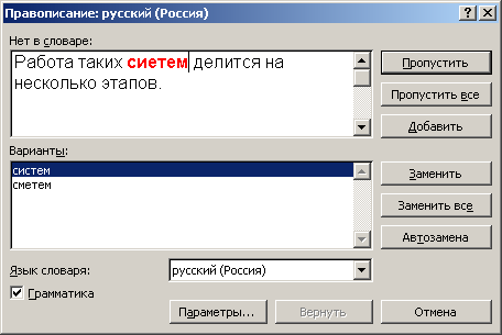 - щелчок на кнопке Отменить правило (Ignore Rule) отменяет проверку данного грамматического правила в текущем документе;