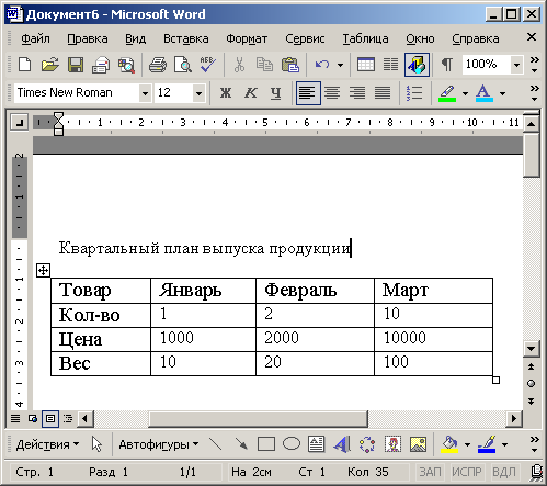 Построенная таблица достаточно проста. Часто возникает надобность сформировать таблицу с подзаголовками, объединяющими серию строк или столбцов. Чтобы научиться объединять ячейки, выполните следующие шаги.