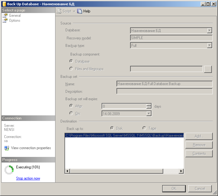 В появившемся окне «Back Up Database» укажите параметры создания резервной копии, как на рисунке ниже, либо другие в случае необходимости. В поле «Destination» необходимо указать расположение создаваемого файла (Рис. 72).