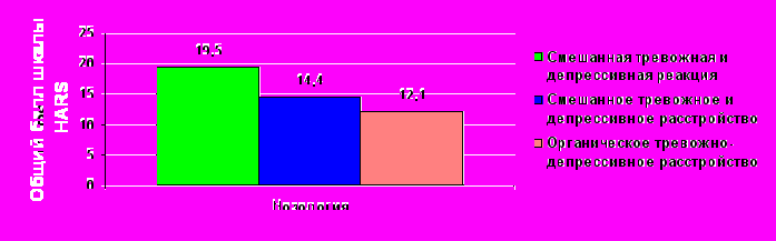 Из представленных на рис.5 данных видно, что наиболее выраженная симптоматика тревоги отмечалась при смешанной тревожной и депрессивной реакции, обусловленной расстройством адаптации, а наименее выраженная- при непсихотическом смешанном тревожном и депрессивном расстройстве органической этиологии. Смешанное тревожное и депрессивное расстройство занимало промежуточное положение между этими группами.