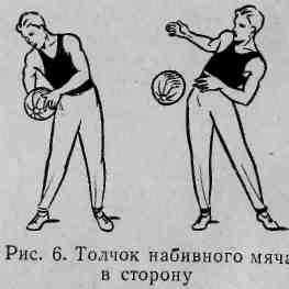 - Толкание ядра поочередно левой и правой рукой, используя разгибательную силу ног.