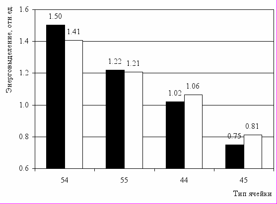 Рис.2. Среднее энерговыделение в типовых ячейках активной зоны реактора СМ с бериллиевым блоком (■) и сепаратором (□) в ЦЗП